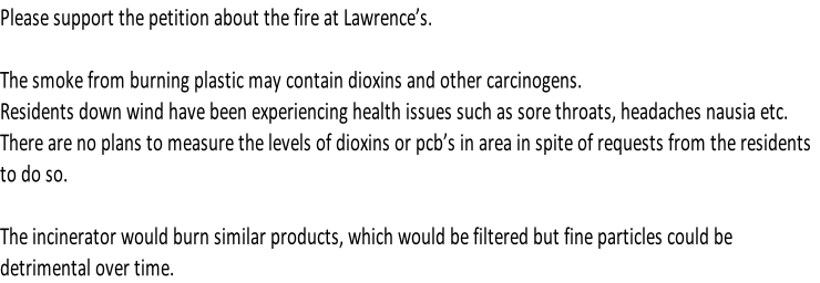 We understand that the burning plastics may have released harmful Dioxins and PCBs into the local atmosphere.